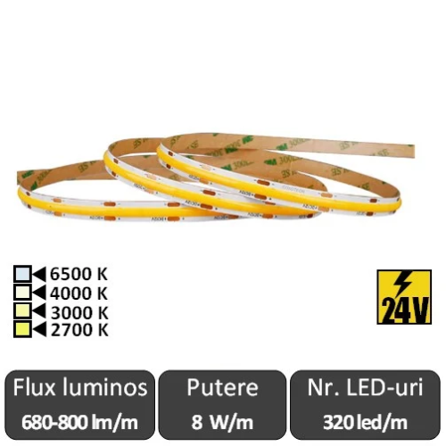Bandă LED flexibilă COB 8W/m 320led/m CRI90 24V IP20